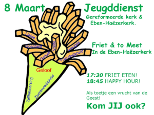 Aanstaande zondag 8 maart ben je uitgenodigd om vanaf half zes, voorafgaand aan de jeugddienst, patat te komen eten. Vanaf kwart voor zeven is er een happy hour. Als toetje ontvang je een vrucht van de geest.